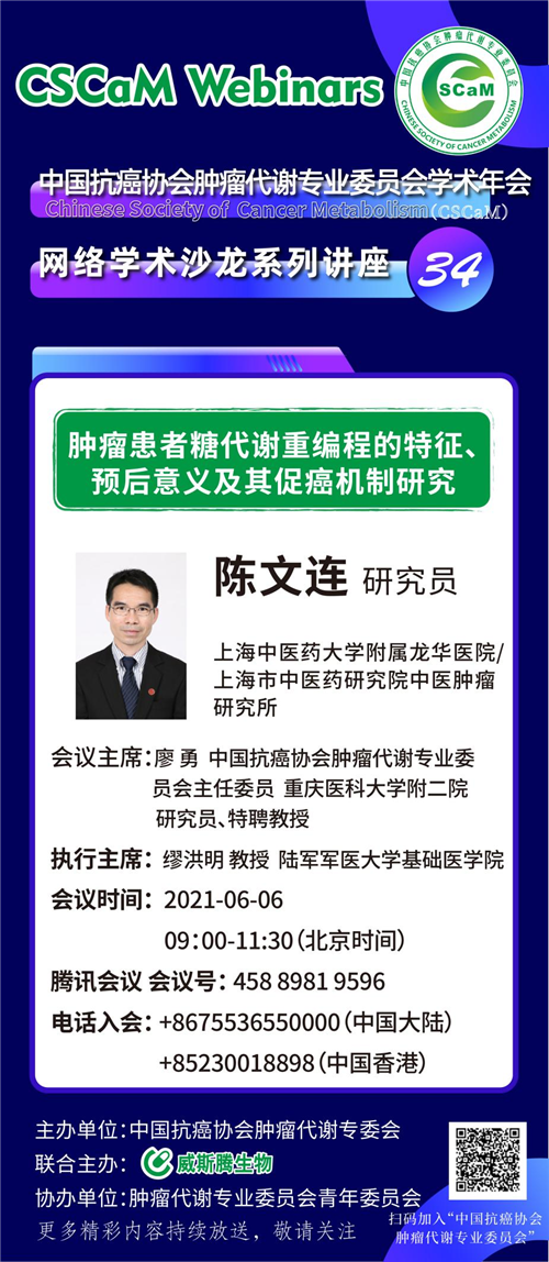 第34次的分享将在06月06日早上9:00--11:30进行,上海中医药大学附属龙华医院/上海市中医药研究院中医肿瘤研究所陈文连研究员将向大家分享《肿瘤患者糖代谢重编程的特征、预后意义及其促癌机制研究》,赶紧关注起来吧!