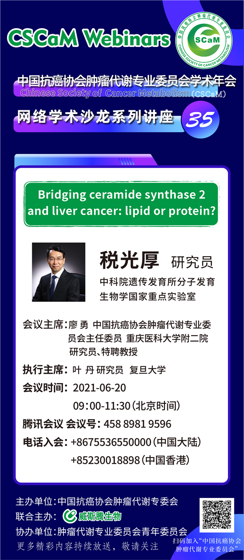 第35次的分享将在06月20日早上9:00--11:30进行,中科院遗传发育所分子发育生物学国家重点实验室研究员税光厚将向大家分享《Bridging ceramide synthase 2 and liver cancer: lipid or protein?》,赶紧关注起来吧!