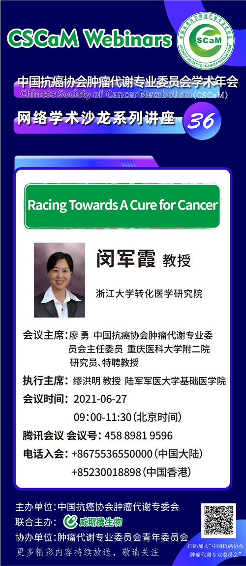 第36次的分享将在06月27日早上9:00--11:30进行,浙江大学转化医学研究院闵军霞教授将向大家分享《Racing Towards A Cure for Cancer》,赶紧关注起来吧!