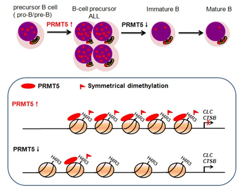 为了进一步研究PRMT5的体内功能以及其异常表达与ALL的相关性,研究人员制作了小鼠骨髓移植模型,发现移植高表达PRMT5的骨髓细胞后,受体小鼠骨髓细胞中pro-B细胞占B系细胞的比例显著升高,而其下游各个分化阶段的B系细胞的比例均显著下降,进一步研究证明PRMT5表达异常升高造成疾病是由于PRMT5及组蛋白异常的高甲基化导致PRMT5下游靶基因CLC和CTSB的沉默,进而抑制B系前体细胞向成熟细胞的分化。