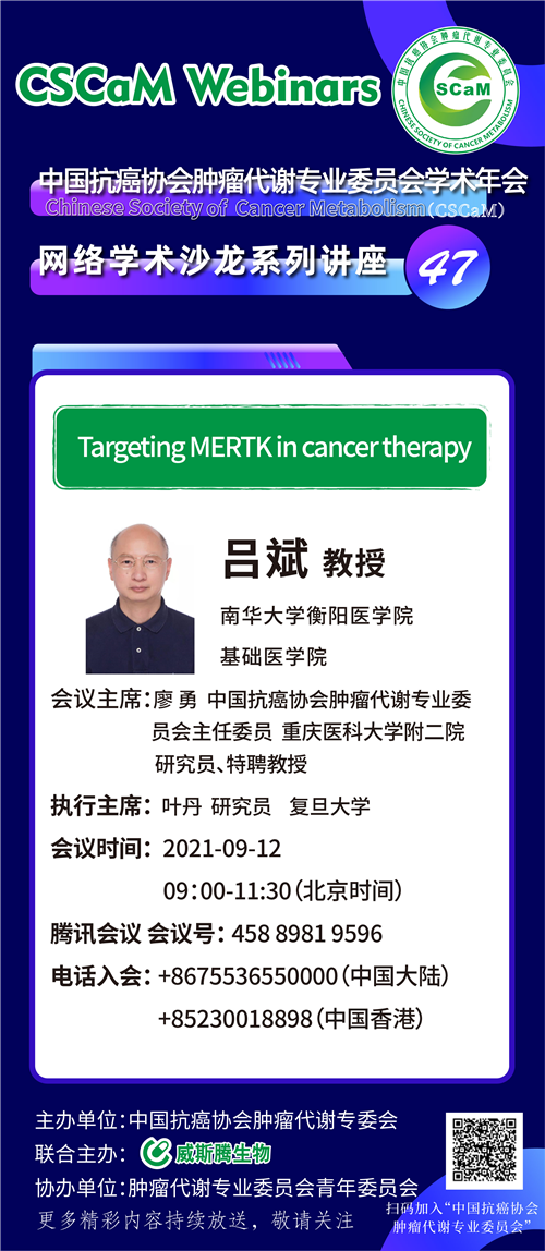 第47次的分享将在9月12日早上9:00--11:30进行,南华大学衡阳医学院吕斌教授将向大家分享《 Targeting MERTK in cancer therapy》,赶紧关注起来吧!