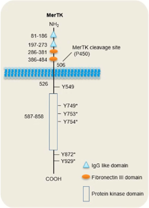 酪氨酸激酶可分为受体酪氨酸激酶(Receptor tyrosine kinase,RTKs)和非受体酪氨酸激酶(Non-RTKs)。RTKs是最大的一类酶联受体,既是跨膜受体,又是酶,可与配体结合,进而将靶蛋白的酪氨酸残基磷酸化。其结构由三部分组成:细胞外的配体结合区域(含有配体结合位点的胞外结构域),细胞膜内的传导区域(单次跨膜的疏水α螺旋区),细胞内信号激活区(含有酪氨酸激酶活性的细胞内结构域)。