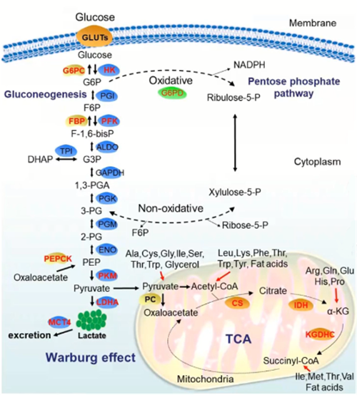 肿瘤是一种代谢异常性疾病,与正常细胞相比,肿瘤细胞会发生异常的糖代谢,即使在氧气充足的情况下仍倾向于通过糖酵解途径供能,这就是普遍存在肿瘤细胞中的沃伯格效应(Warberg effect),也是肿瘤细胞的显著特征之一。与氧化磷酸化相比,糖酵解产生ATP的效率虽低,但速度快,十分利于肿瘤细胞的快速增殖。并且肿瘤细胞可通过糖酵解获得各种代谢中间产物,可用于合成脂肪、蛋白质和核酸,以满足其活跃的合成代谢需求。此外,糖酵解过程会产生大量乳酸,导致微环境酸化,有助于肿瘤细胞的侵袭和免疫逃逸。因此,肿瘤细胞中糖酵解水平会升高,葡萄糖消耗增多,同时产生大量乳酸。其摄取的葡萄糖主要流向了糖酵解或磷酸戊糖途径,线粒体内的有氧糖代谢会相对减弱,三羧酸循环和氧化磷酸化作用也会受阻。近年研究表明,除葡萄糖和谷氨酰胺外,肿瘤细胞还可利用乳酸、醋酸盐、酮体等其他物质,通过线粒体TCA循环产生大量ATP以促进增殖、抵抗凋亡。另外,肿瘤细胞磷酸戊糖途径的代谢活性也会显著增强,该通路可为肿瘤合成代谢提供大量NADPH以维持氧化还原稳态。