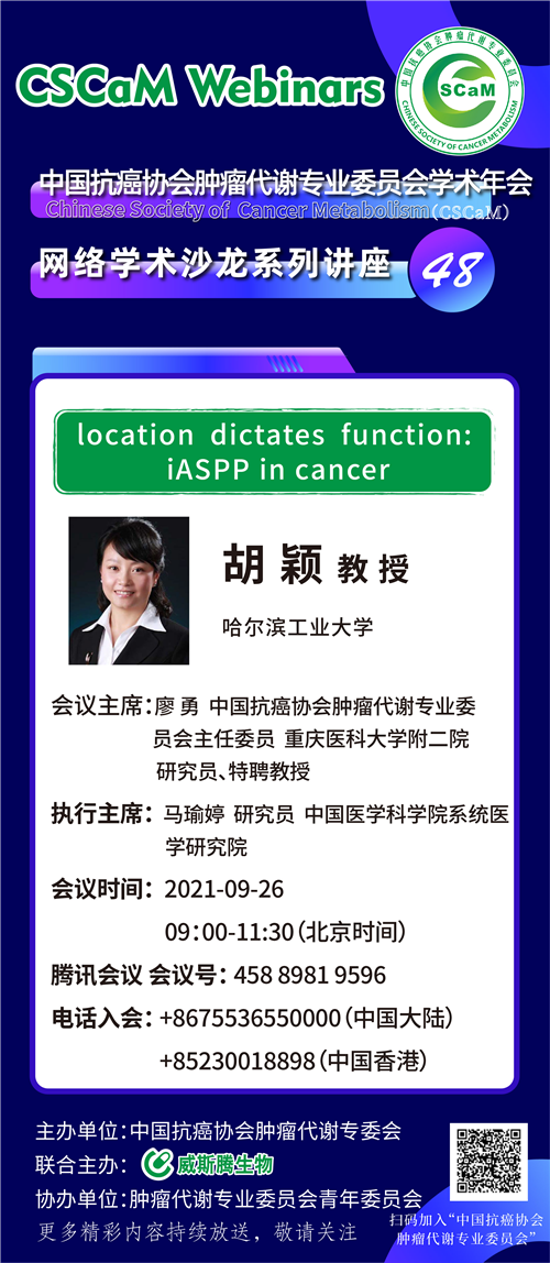 第48次的分享将在9月26日早上9:00--11:30进行,哈尔滨工业大学胡颖教授,将向大家分享《 location dictates function: iASPP in cancer》,赶紧关注起来吧!